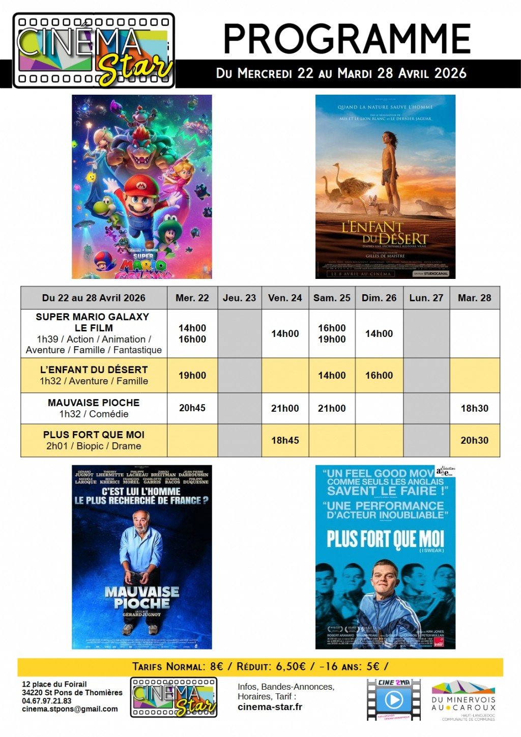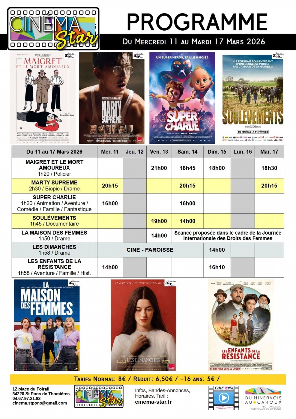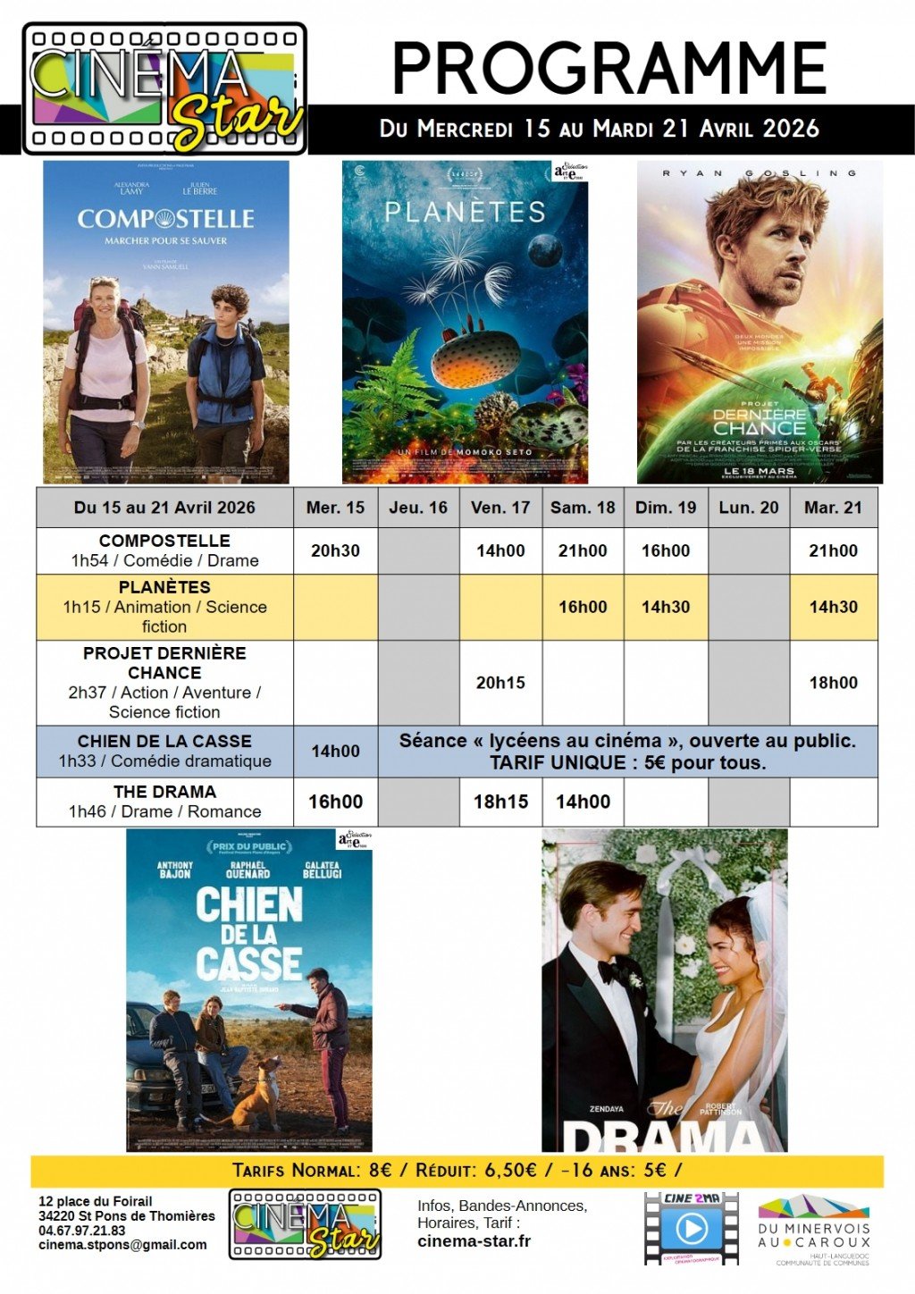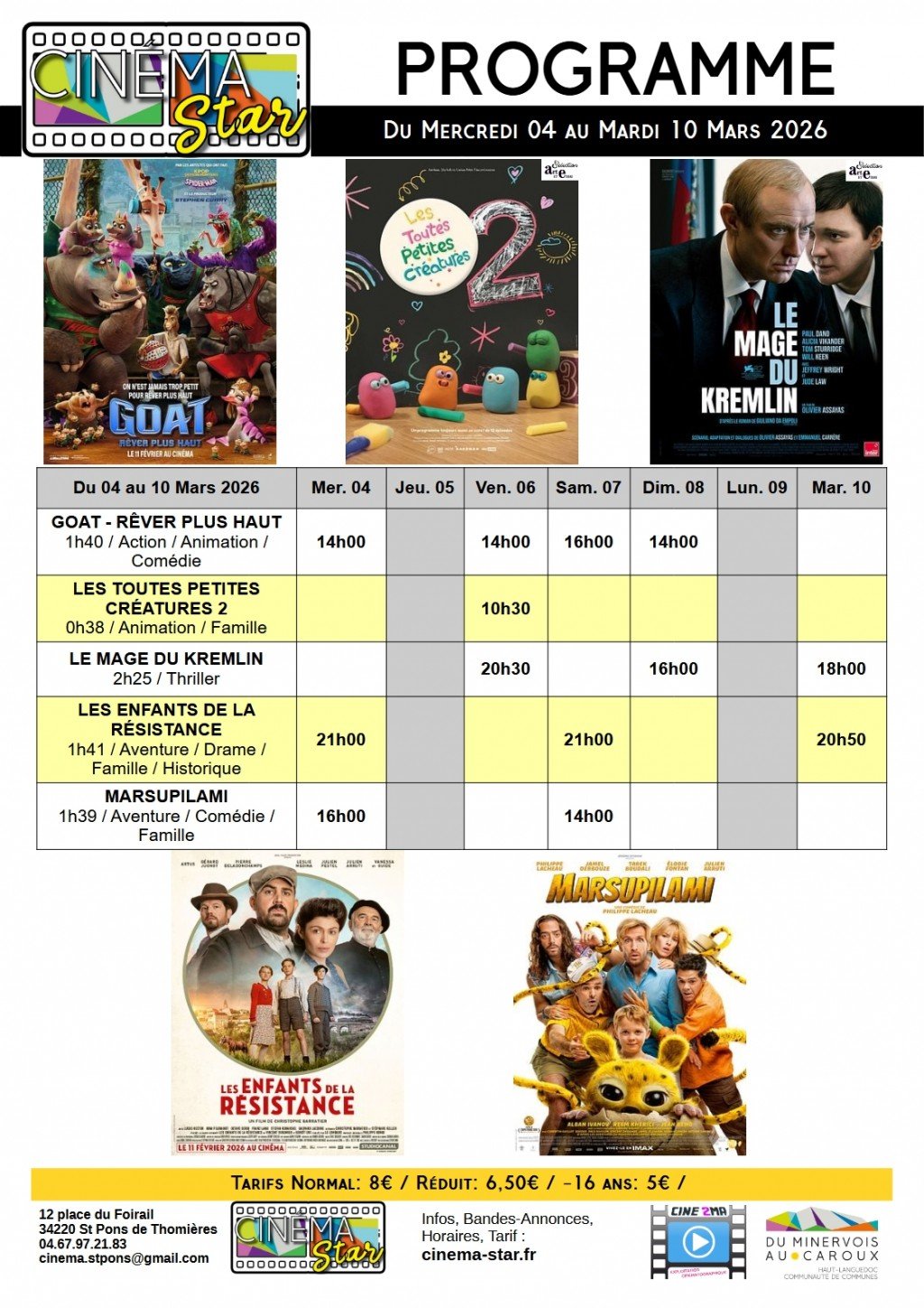 Cinéma Star, 12 Place du Foirail, 34220 Saint-Pons-de-Thomières | Mentions légales | Contact | Tel : 04 67 97 21 83