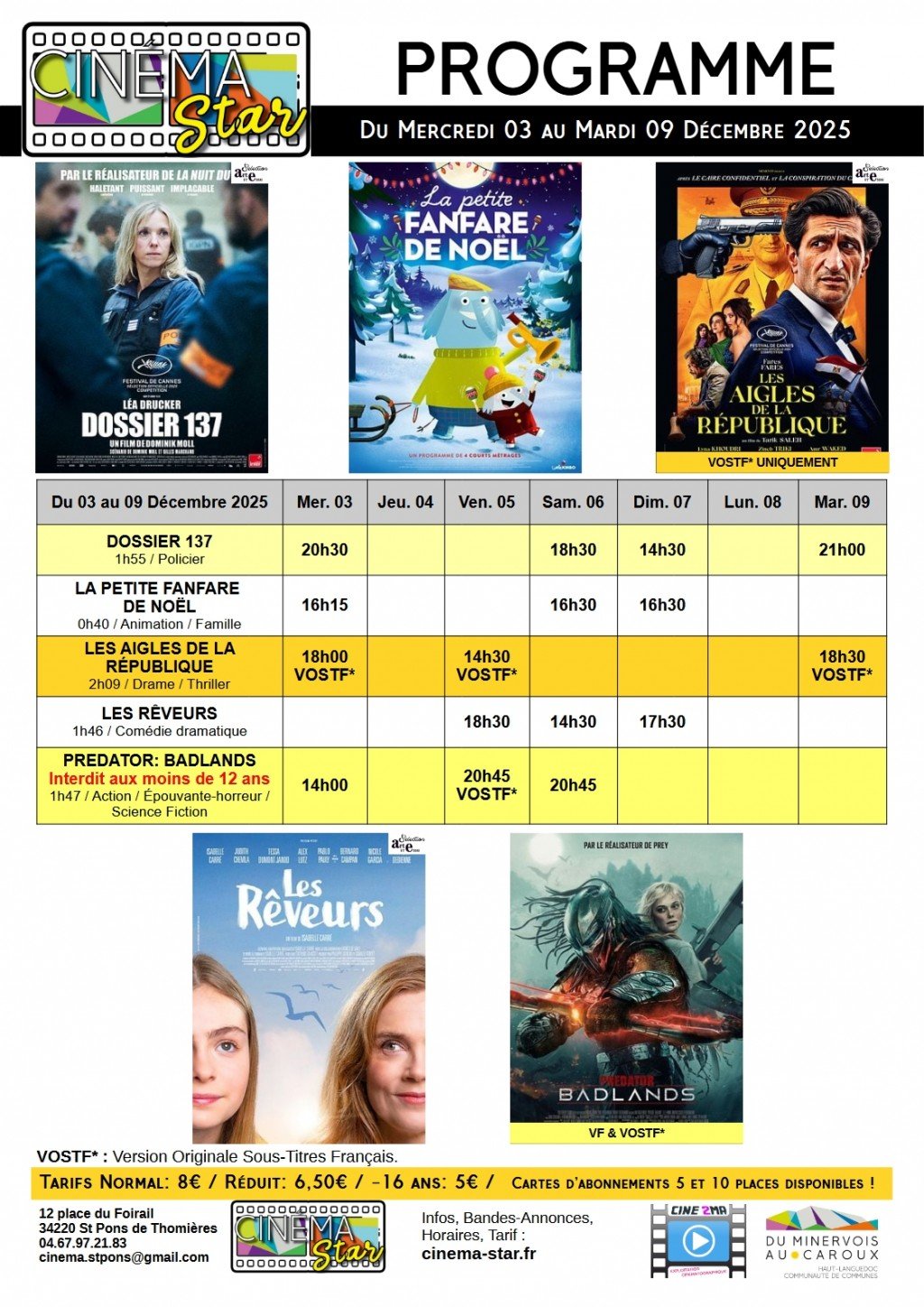 Cinéma Star, 12 Place du Foirail, 34220 Saint-Pons-de-Thomières | Mentions légales | Contact | Tel : 04 67 97 21 83